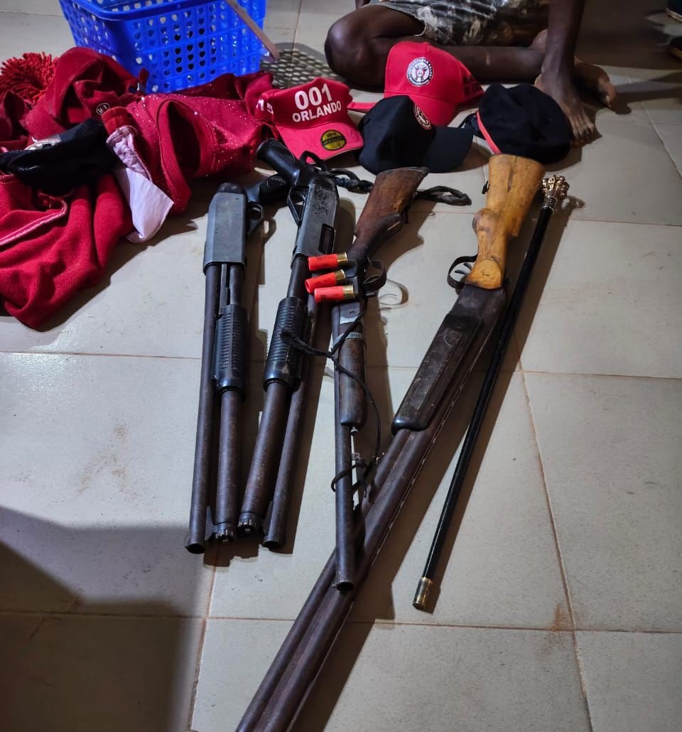 Recovered were two pump action guns, two English-made double-barrel guns, three live cartridges, red cloth and regalia bearing cult insignia and three black caps, as well as red caps with inscriptions associated with Vikings Confraternity.