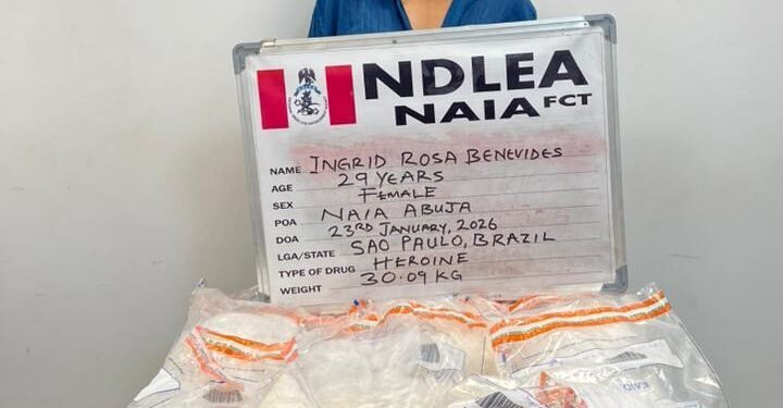 The National Drug Law Enforcement Agency (NDLEA) on Friday, January 23, 2026, arrested a 30-year-old Brazilian lady, Ms Ingrid Rosa Benevides, at the Nnamdi Azikiwe International Airport, Abuja, for allegedly bringing a total of 30.09 kilogrammes of white substances, suspected to be heroin and concealed in factory-sealed coffee packs worth over N3 billion in street value, into Nigeria.