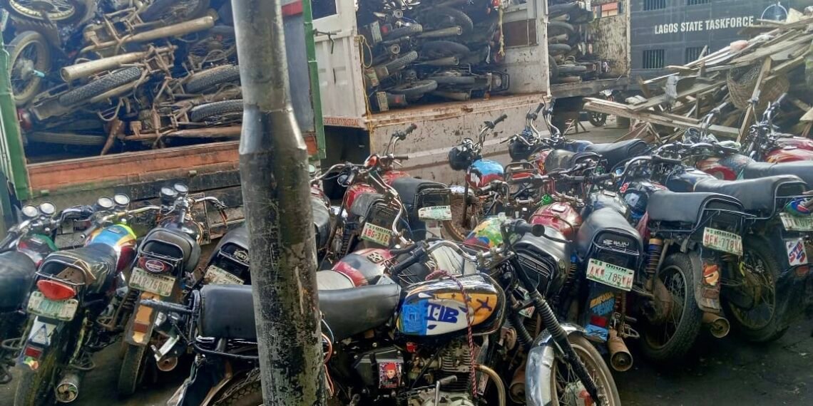 In its continued effort to enforce traffic laws within the metropolis, the Lagos State Taskforce has impounded 115 motorcycles from operators who are persistently violating the ban on certain routes, highways and bridges across the state.