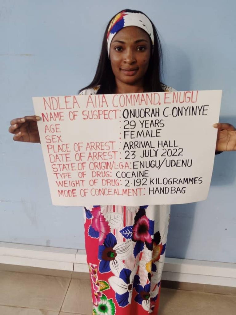 NDLEA operatives also on Saturday, July 23, arrested 29-year-old Ms. Onuorah Caritas Onyinye at the Enugu airport on arrival on Ethiopian airline flight from Addis Ababa.